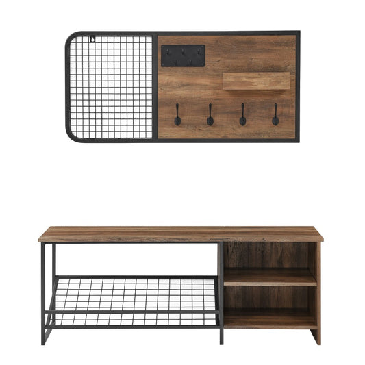 Modern Entry Bench with Shoe Storage and Wall Organizer Set - Rustic Oak