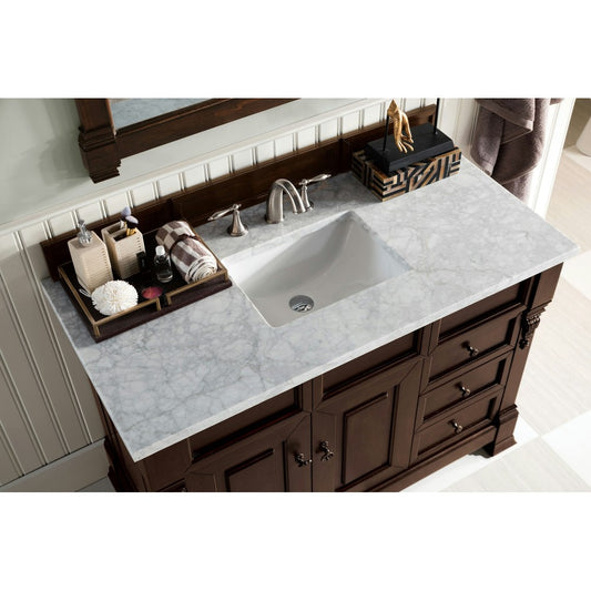 Brookfield 48" Single Vanity, Burnished Mahogany w/ 3 CM Carrara Marble Top