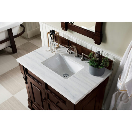 Brookfield 36" Single Vanity, Burnished Mahogany w/ 3 CM Carrara Marble Top