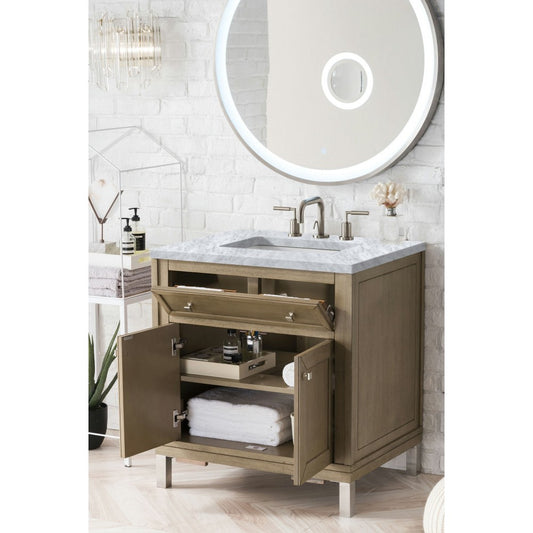 Chicago 30" Single Vanity, Whitewashed Walnut w/ 3 CM Carrara Marble Top