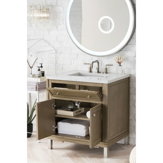 Chicago 30" Single Vanity, Whitewashed Walnut w/ 3 CM Eternal Serena Quartz Top