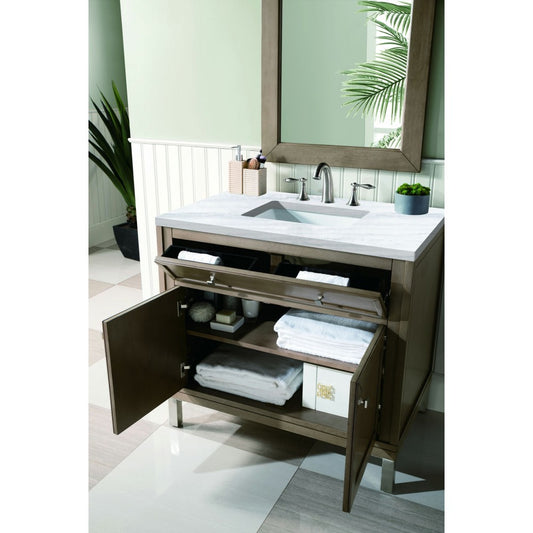 Chicago 36" Single Vanity, Whitewashed Walnut w/ 3 CM Carrara Marble Top