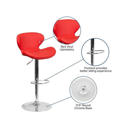 Contemporary Red Vinyl Adjustable Height Barstool with Curved Back and Chrome Base