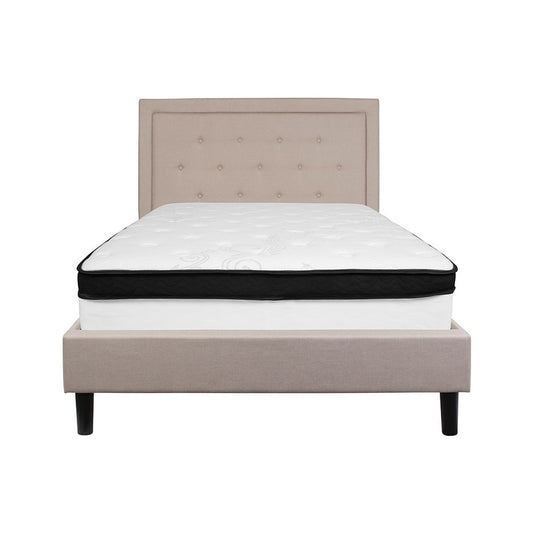 Roxbury Full Size Tufted Upholstered Platform Bed in Beige Fabric with Memory Foam Mattress