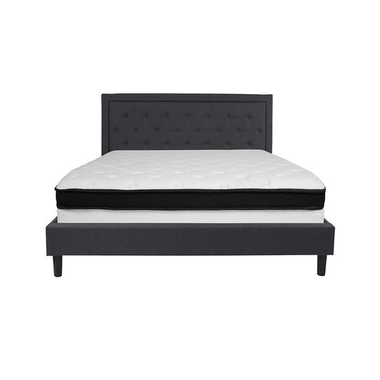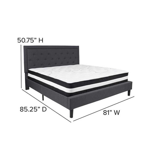 Roxbury King Size Tufted Upholstered Platform Bed in Dark Gray Fabric with Pocket Spring Mattress