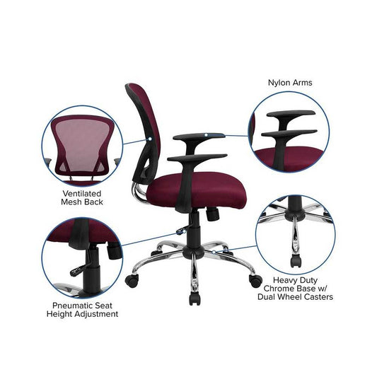 Mid-Back Burgundy Mesh Swivel Task Office Chair with Chrome Base and Arms