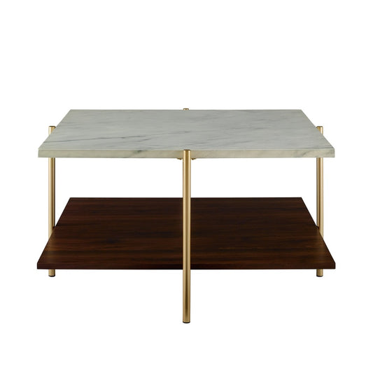 Mid Century Modern Square Coffee Table - Faux White Marble/Dark Walnut/Gold