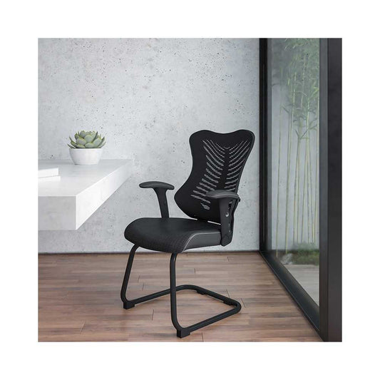 Designer Black Mesh Sled Base Side Reception Chair with Adjustable Arms