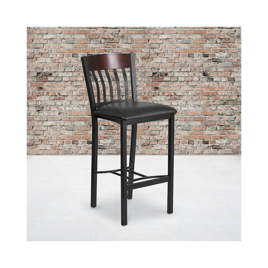 Eclipse Series Vertical Back Black Metal and Walnut Wood Restaurant Barstool with Black Vinyl Seat