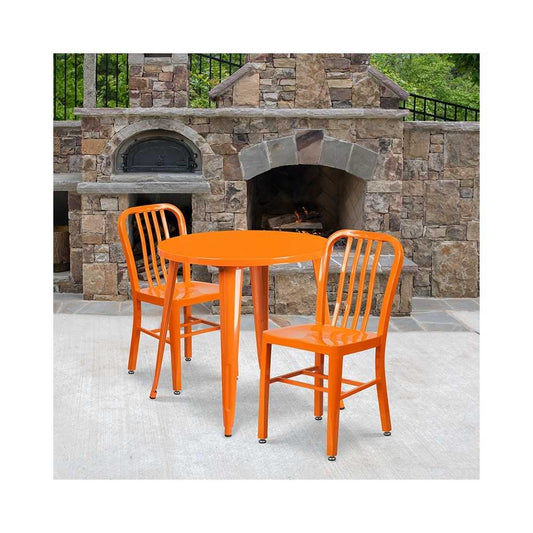 Commercial Grade 30" Round Orange Metal Indoor-Outdoor Table Set with 2 Vertical Slat Back Chairs