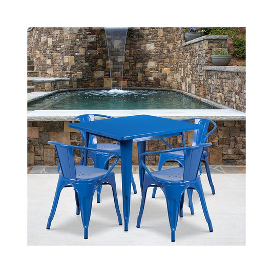 Commercial Grade 31.5" Square Blue Metal Indoor-Outdoor Table Set with 4 Arm Chairs