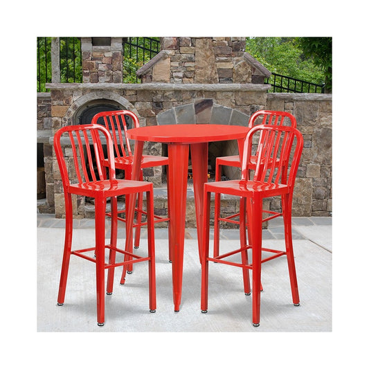 Commercial Grade 30" Round Red Metal Indoor-Outdoor Bar Table Set with 4 Vertical Slat Back Stools