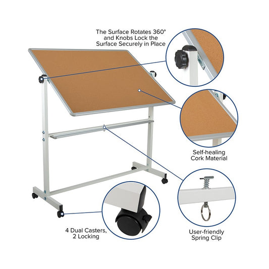 53"W x 62.5"H Reversible Mobile Cork Bulletin Board and White Board with Pen Tray