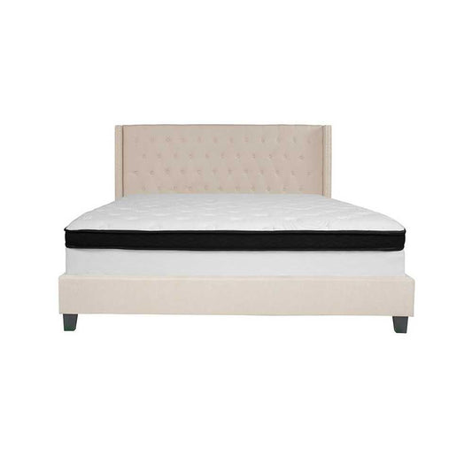 Riverdale King Size Tufted Upholstered Platform Bed in Beige Fabric with Memory Foam Mattress