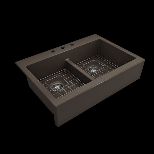 Front Drop-In Fireclay 34 in. 50/50 Double Bowl Kitchen Sink with Protective Bottom Grids and Strainers in Matte Brown