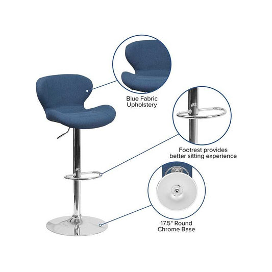 Contemporary Blue Fabric Adjustable Height Barstool with Curved Back and Chrome Base
