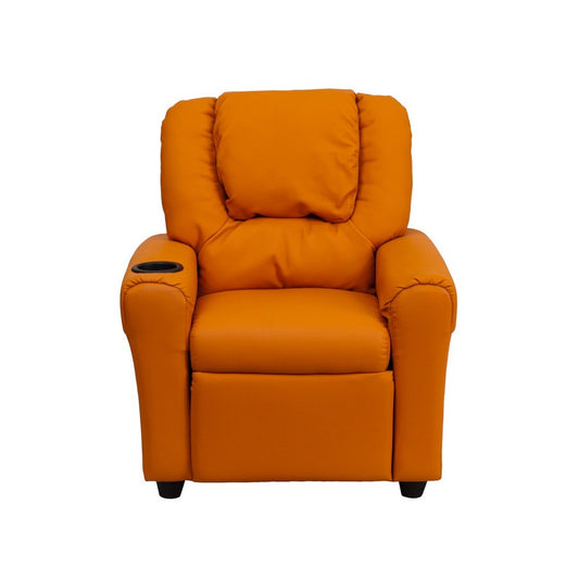 Contemporary Orange Vinyl Kids Recliner with Cup Holder and Headrest