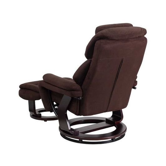 Contemporary Multi-Position Recliner and Ottoman with Swivel Mahogany Wood Base in Brown Microfiber