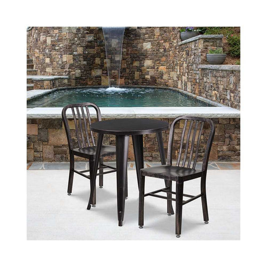 Commercial Grade 24" Round Black-Antique Gold Metal Indoor-Outdoor Table Set with 2 Vertical Slat Back Chairs