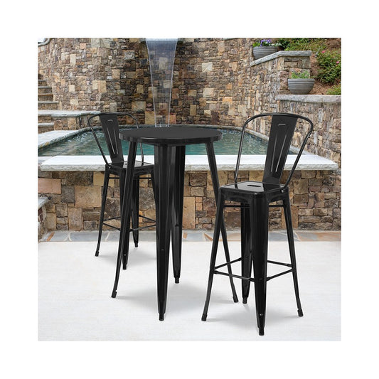 Commercial Grade 24" Round Black Metal Indoor-Outdoor Bar Table Set with 2 Cafe Stools