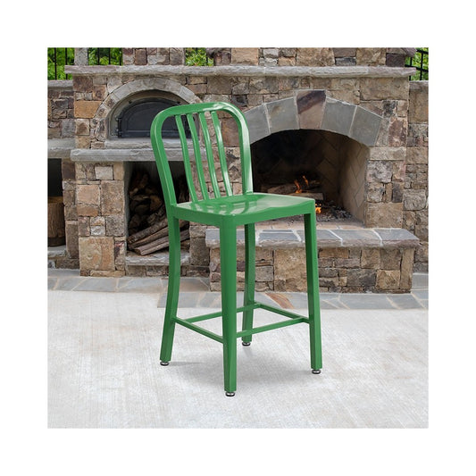 Commercial Grade 24" High Green Metal Indoor-Outdoor Counter Height Stool with Vertical Slat Back