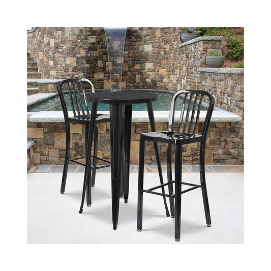 Commercial Grade 24" Round Black Metal Indoor-Outdoor Bar Table Set with 2 Vertical Slat Back Stools
