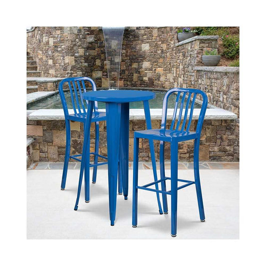 Commercial Grade 24" Round Blue Metal Indoor-Outdoor Bar Table Set with 2 Vertical Slat Back Stools