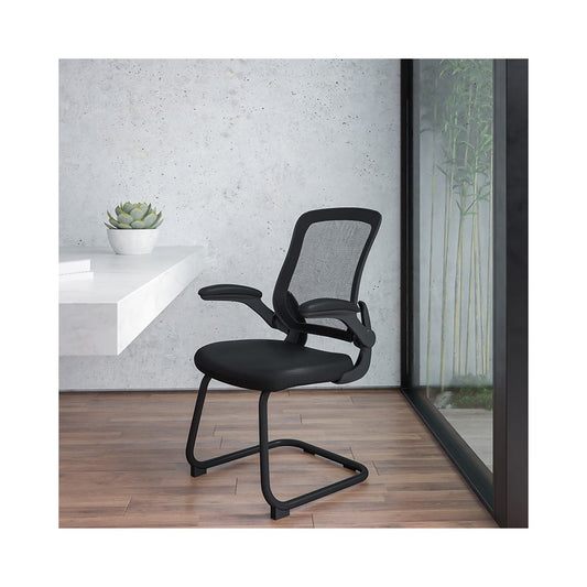 Black Mesh Sled Base Side Reception Chair with Flip-Up Arms