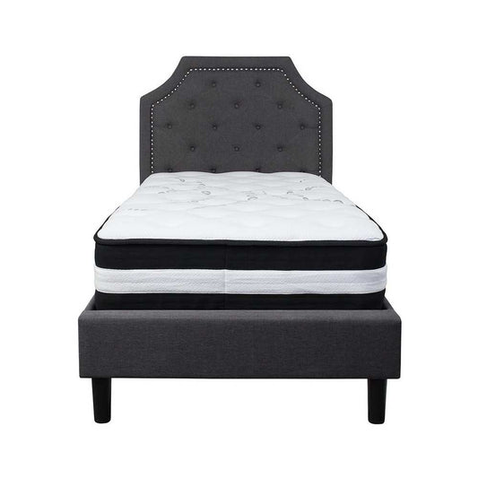 Brighton Twin Size Tufted Upholstered Platform Bed in Dark Gray Fabric with Pocket Spring Mattress