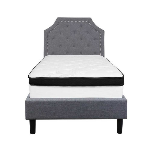 Brighton Twin Size Tufted Upholstered Platform Bed in Light Gray Fabric with Memory Foam Mattress
