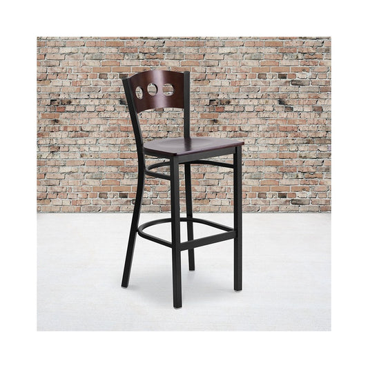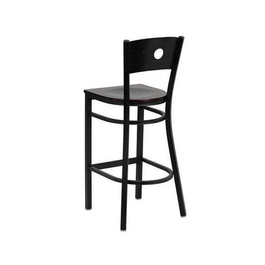 Black Circle Back Metal Restaurant Barstool - Mahogany Wood Seat