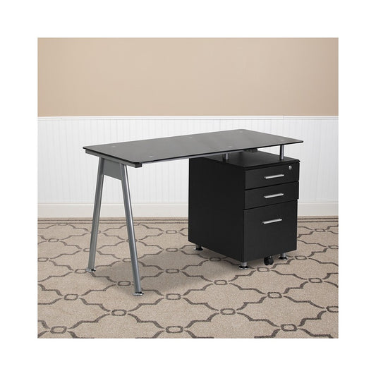 Black Glass L-Shape Corner Computer Desk with Pull-Out Keyboard Tray