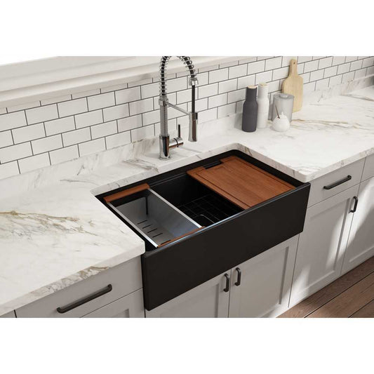Apron Front Step Rim with Integrated Work Station Fireclay 33 in. Single Bowl Kitchen Sink with Accessories in Matte Black