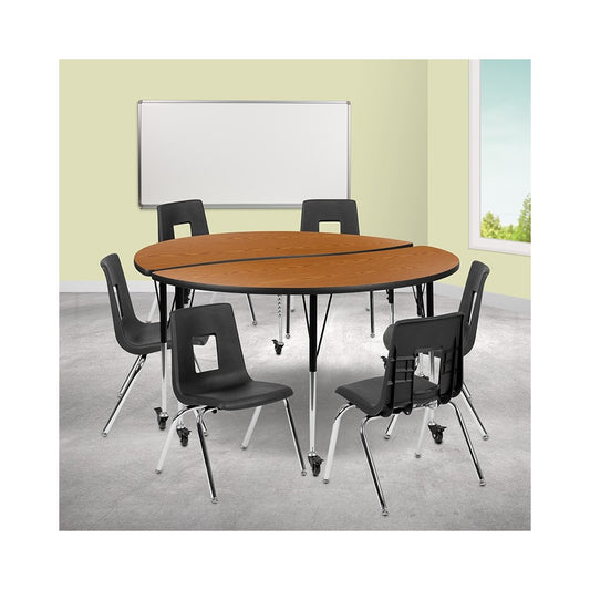 Mobile 60" Circle Wave Collaborative Laminate Activity Table Set with 18" Student Stack Chairs, Oak/Black