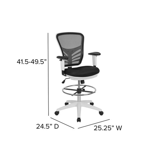 Mid-Back Black Mesh Ergonomic Drafting Chair with Adjustable Chrome Foot Ring, Adjustable Arms and White Frame