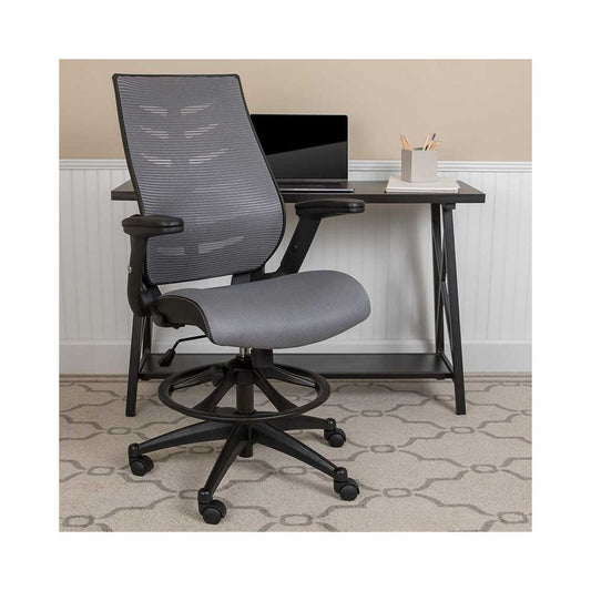 High Back Dark Gray Mesh Spine-Back Ergonomic Drafting Chair with Adjustable Foot Ring and Adjustable Flip-Up Arms