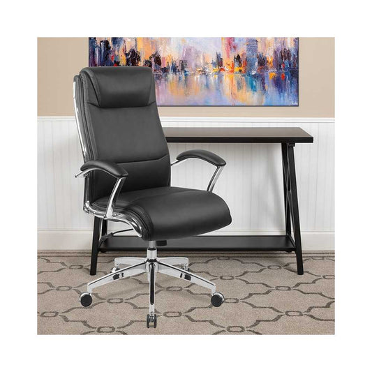 High Back Designer Black LeatherSoft Smooth Upholstered Executive Swivel Office Chair with Chrome Base and Arms