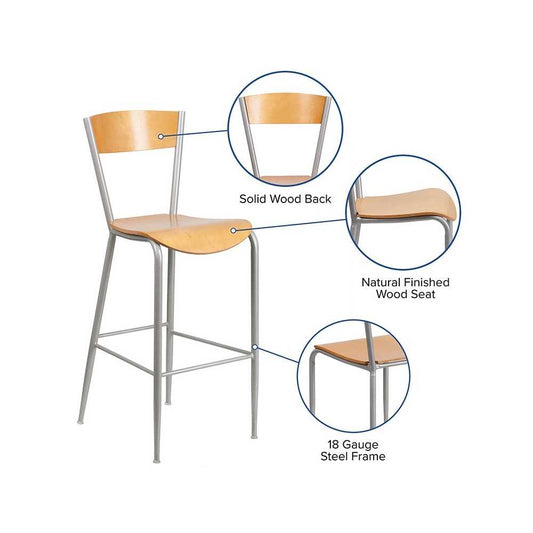 Invincible Series Silver Metal Restaurant Barstool - Natural Wood Back & Seat