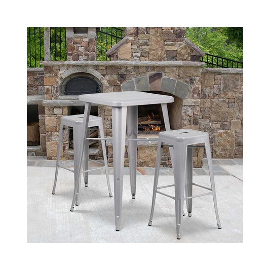 Commercial Grade 23.75" Square Silver Metal Indoor-Outdoor Bar Table Set with 2 Square Seat Backless Stools