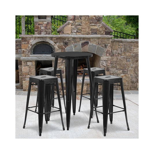 Commercial Grade 24" Round Black Metal Indoor-Outdoor Bar Table Set with 4 Square Seat Backless Stools