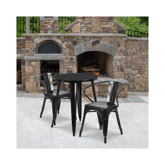 Commercial Grade 24" Round Black Metal Indoor-Outdoor Table Set with 2 Arm Chairs