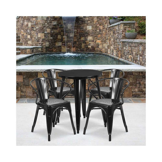 Commercial Grade 24" Round Black Metal Indoor-Outdoor Table Set with 4 Arm Chairs