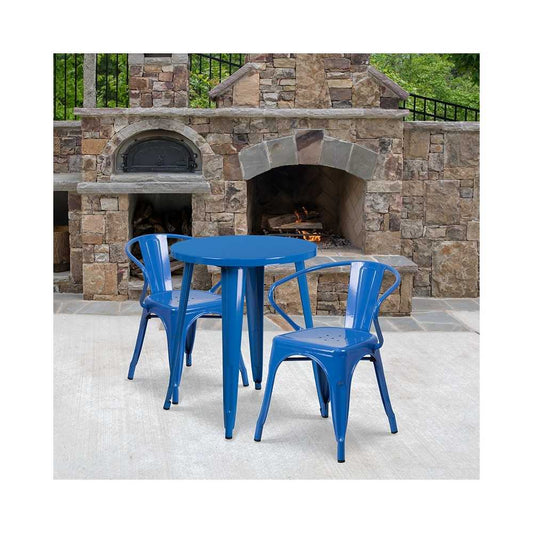 Commercial Grade 24" Round Blue Metal Indoor-Outdoor Table Set with 2 Arm Chairs
