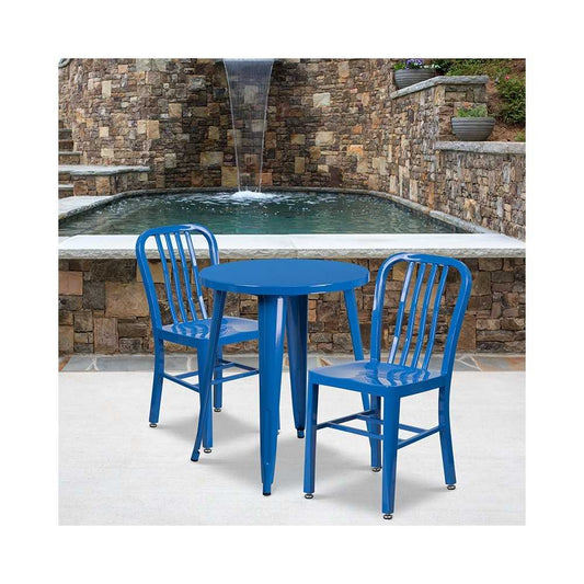 Commercial Grade 24" Round Blue Metal Indoor-Outdoor Table Set with 2 Vertical Slat Back Chairs