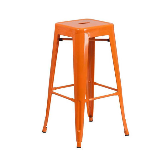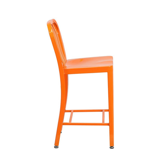 Commercial Grade 24" High Orange Metal Indoor-Outdoor Counter Height Stool with Vertical Slat Back