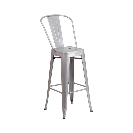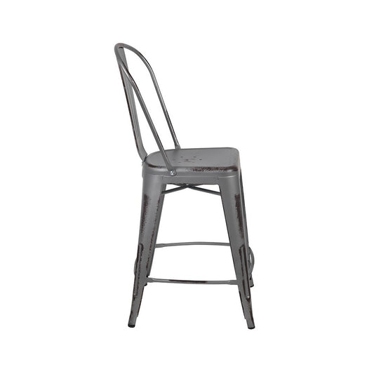 Commercial Grade 24" High Distressed Silver Gray Metal Indoor-Outdoor Counter Height Stool with Back