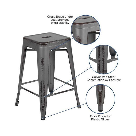 Commercial Grade 24" High Backless Distressed Silver Gray Metal Indoor-Outdoor Counter Height Stool