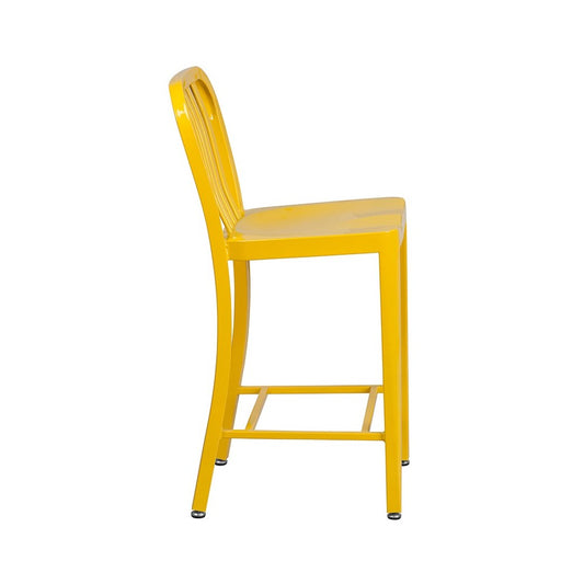 Commercial Grade 24" High Yellow Metal Indoor-Outdoor Counter Height Stool with Vertical Slat Back