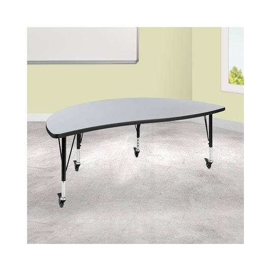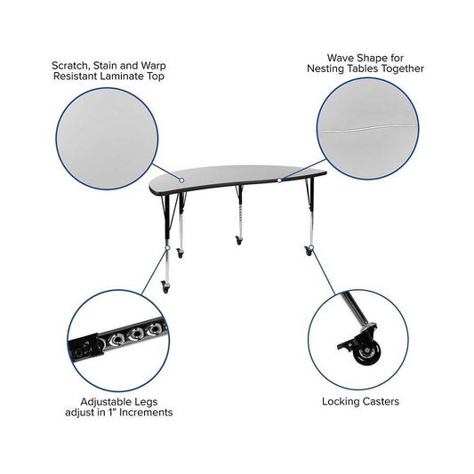 Mobile 60" Half Circle Wave Collaborative Gray Thermal Laminate Activity Table - Height Adjustable Short Legs
