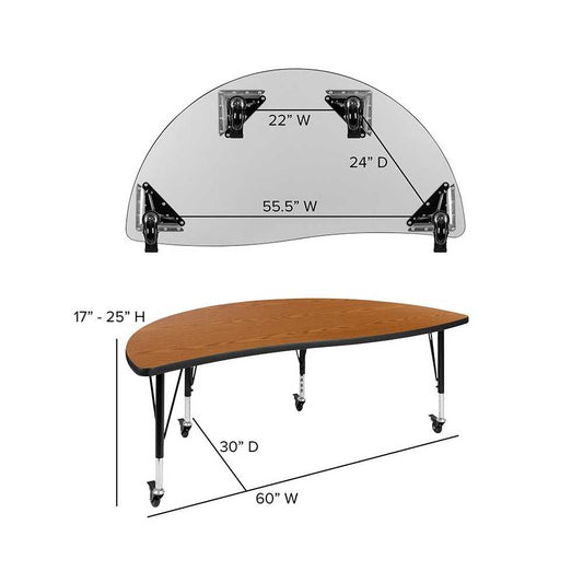 Mobile 60" Half Circle Wave Collaborative Oak Thermal Laminate Activity Table - Standard Height Adjustable Legs